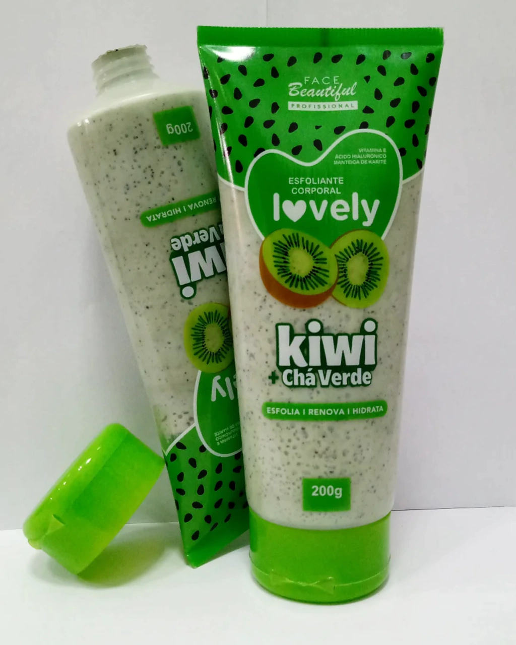 O Esfoliante Corporal Lovely Kiwi + Chá Verde, da Face Beautiful, é um produto de skincare que combina os benefícios antioxidantes do kiwi e chá verde com hidratação da Vitamina E, Ácido Hialurônico e Manteiga de Karité para esfoliar suavemente, remover células mortas, renovar, hidratar e deixar a pele macia, fresca e com toque aveludado.
